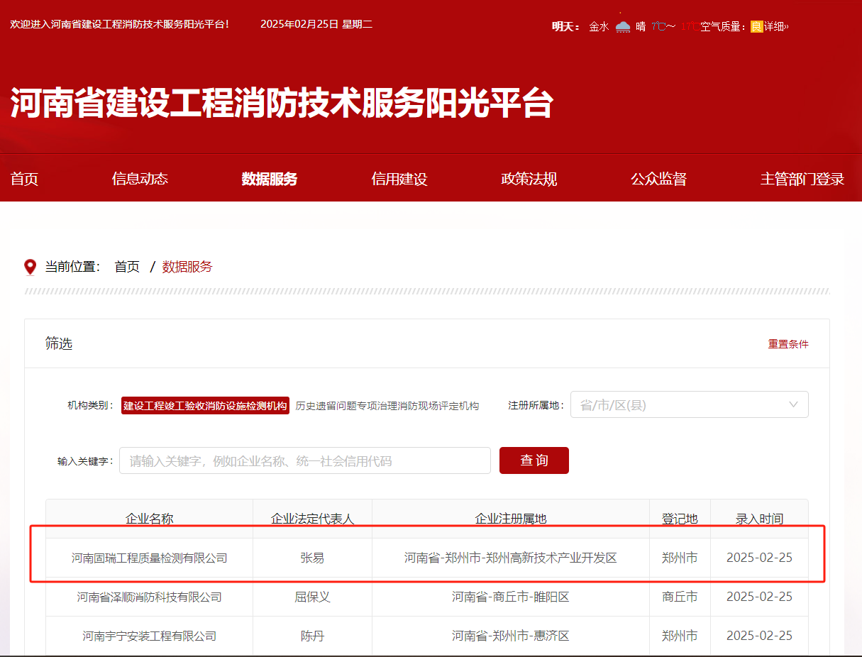 熱烈祝賀河南固瑞工程質(zhì)量檢測(cè)有限公司入冊(cè)河南省建設(shè)工程消防技術(shù)服務(wù)陽(yáng)光平臺(tái)!!!